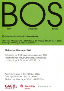 05. Oktober 2025, 12.00 Uhr: Ausstellungseröffnung: „BOS. Boell, Osterwald, Scholz“, Atelierhaus Alteburger Wall, Köln