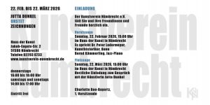 22. Februar 2026, 15.00 Uhr: Ausstellungseröffnung: „Jutta Dunkel. Unstet. Zeichnungen“, Kunstverein Nümbrecht Category Aktuell Beitragsnavigation Previous PostPrevious Szilard Huszank. Tremble Like a FlowerNext PostNext23. Januar 2026, 19.00 Uhr: Ausstellungseröffnung: „Ulrike Donié / Andrea Raak: Kipppunkt“, Neuer Kunstverein Wuppertal